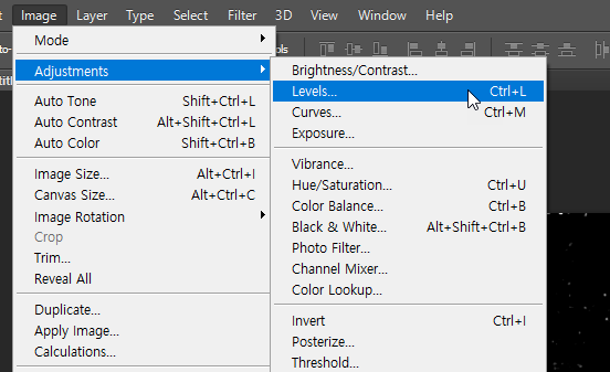 6)상단의 image 메뉴에서 adjustments의 levels로 이동합니다.