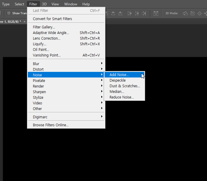 2)상단의 filter 메뉴에서 noise의 add noise를 선택합니다.