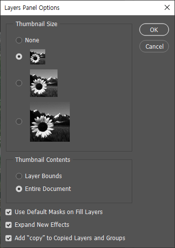 3)layers panel 옵션에서 썸네일의 크기를 선택하고 확인합니다.