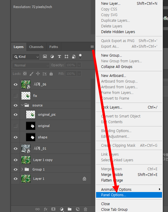 2)썸네일의 크기를 변경하려면 레이어 패널의 상단 우측을 클릭하고 panel options를 선택합니다.