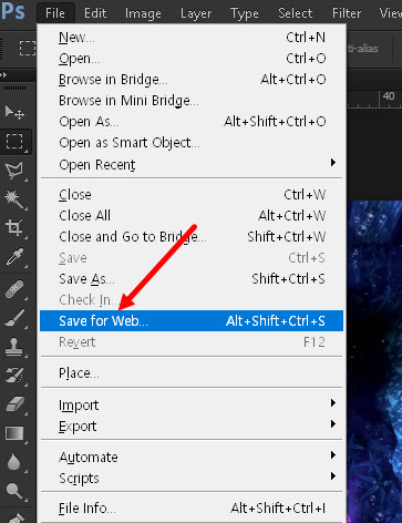 4)상단의 file 메뉴에서 save for web로 이동합니다.
