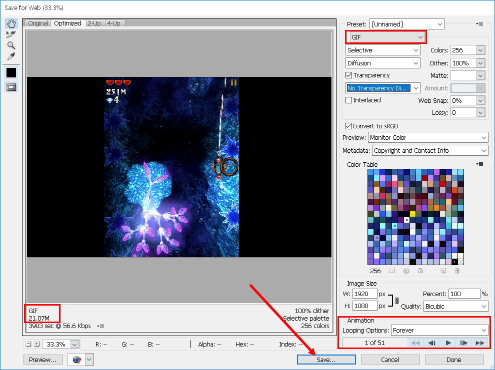 5)GIF 포맷을 선택합니다. 우측 하단의 looping options에서 forever를 선택하면 애니메이션이 반복재생됩니다.