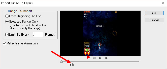 2)가져오기 옵션에서 동영상 미리보기를 확인할수있습니다. selected range only에 체크하면 미리보기 하단에서 gif로 만드려는 애니메이션의 범위를 설정할수있습니다. make frame animation에 체크하고 확인합니다.