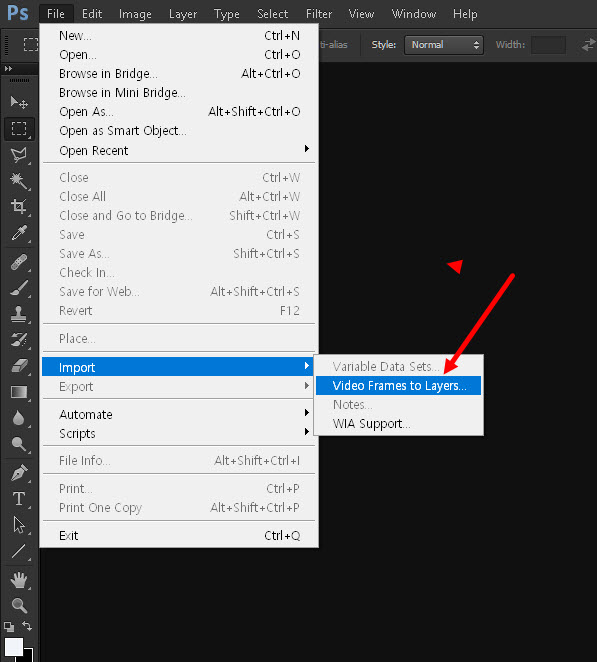1)상단의 file 메뉴에서 import의 video frames to layer로 이동하여 동영상을 가져오기합니다.