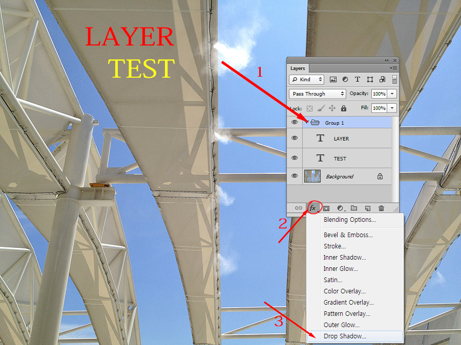 photoshop cs6 버전부터 레이어 그룹(layer group)에 이펙트를 적용할수있는 기능이 추가되었습니다. 이펙트를 그룹에 추가하면 그룹의 하위에 존재하는 모든 레이어에 이펙트를 일괄 적용할수있습니다.