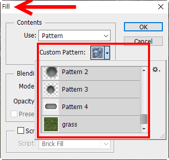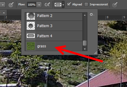 4)pattern stamp tool의 패턴에서 사용자 정의 패턴을 사용할수있습니다.