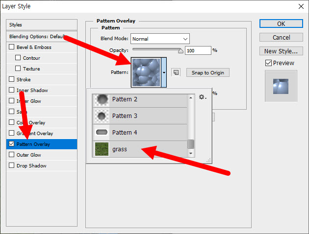 8)레이어 스타일의 패턴 오버레이(pattern overlay)에서 사용자 정의 패턴을 사용할수있습니다.
