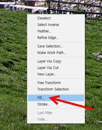 5)선택 영역 채우기(fill)에서 사용자 정의 패턴을 사용할수있습니다. 선택한 영역을 마우스 우클릭하고 fill로 이동합니다.