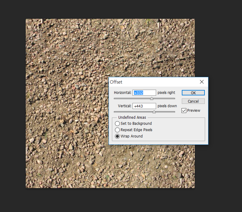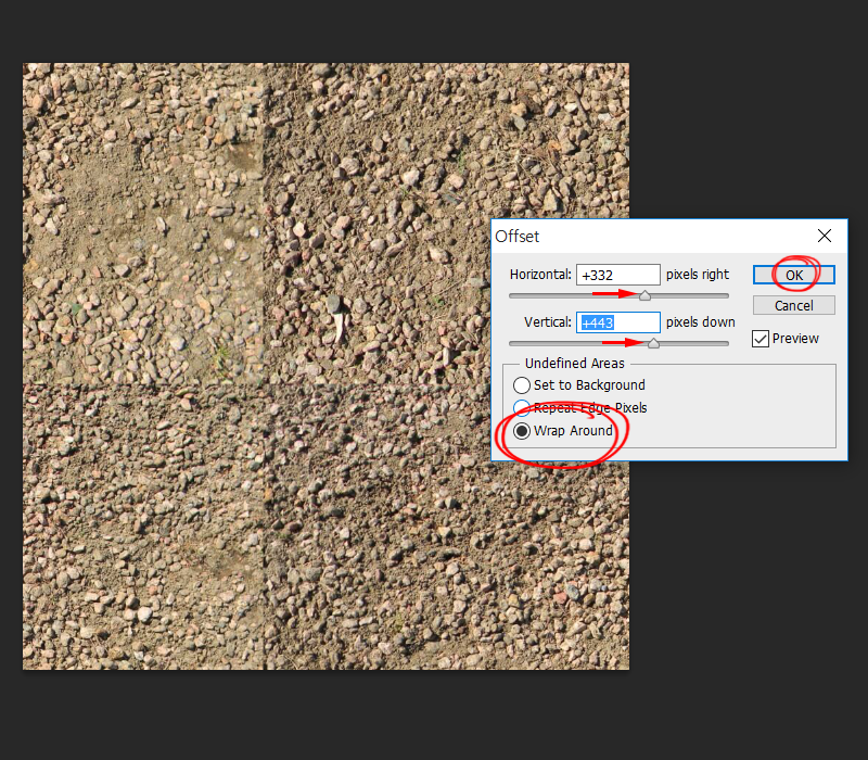 4)wrap around에 체크하고 수평(horizontal), 수직(vertical) 방향으로 오프셋을 적용합니다.