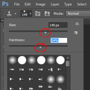 6)브러시 옵션에서 size와 hardness 수치를 조절합니다.