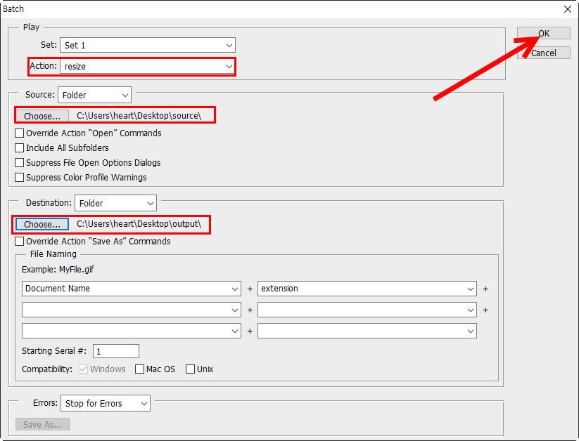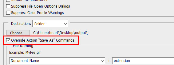 13)액션에 저장(save)이 포함되어있는 경우 batch의 옵션중 override action "save as" commands에 체크한다.