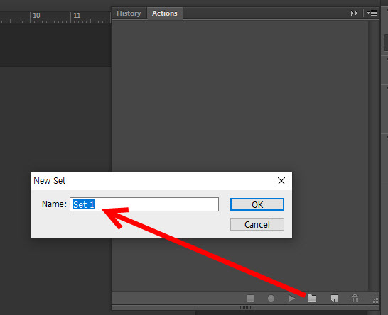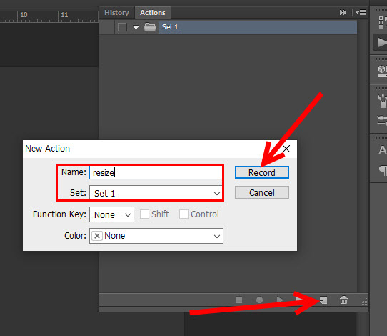 3)set에 새로운 액션을 추가한다. 액션의 이름, 액션의 소속(set)을 설정하고 record를 클릭하면 이후에 포토샵에서 수행하는 명령을 기록하기 시작한다.