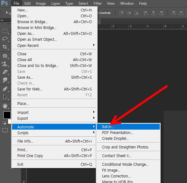 8)동일한 작업을 다수의 이미지에 일괄 적용하려면 상단의 file 메뉴에서 automate의 batch로 이동한다.