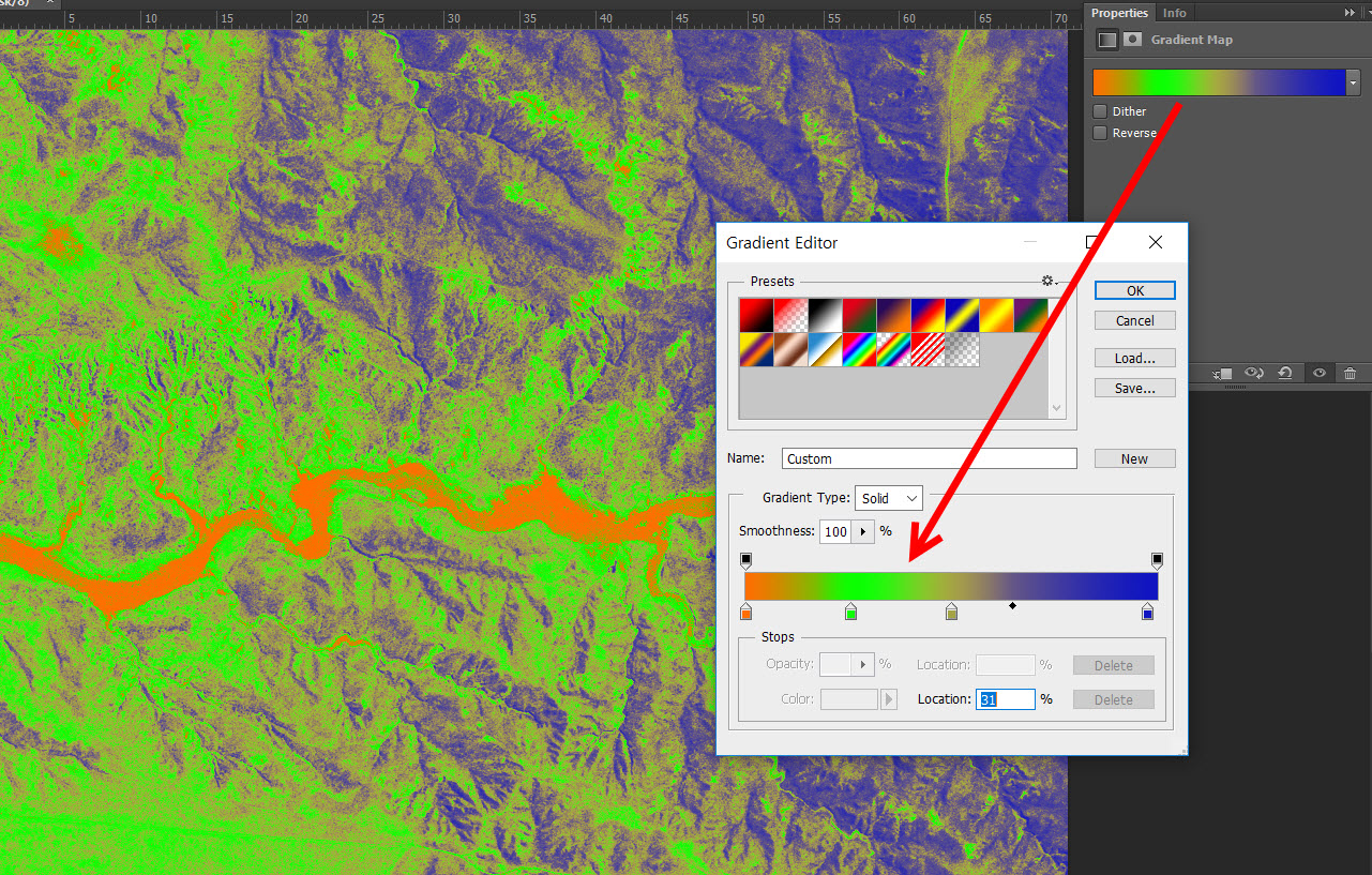 4)gradient map 속성에서 사용자 지정 그라디언트 색상을 설정하면 이미지의 그레이스케일 값에 대응하여 지정한 컬러가 맵핑되는것을 확인할수있습니다.