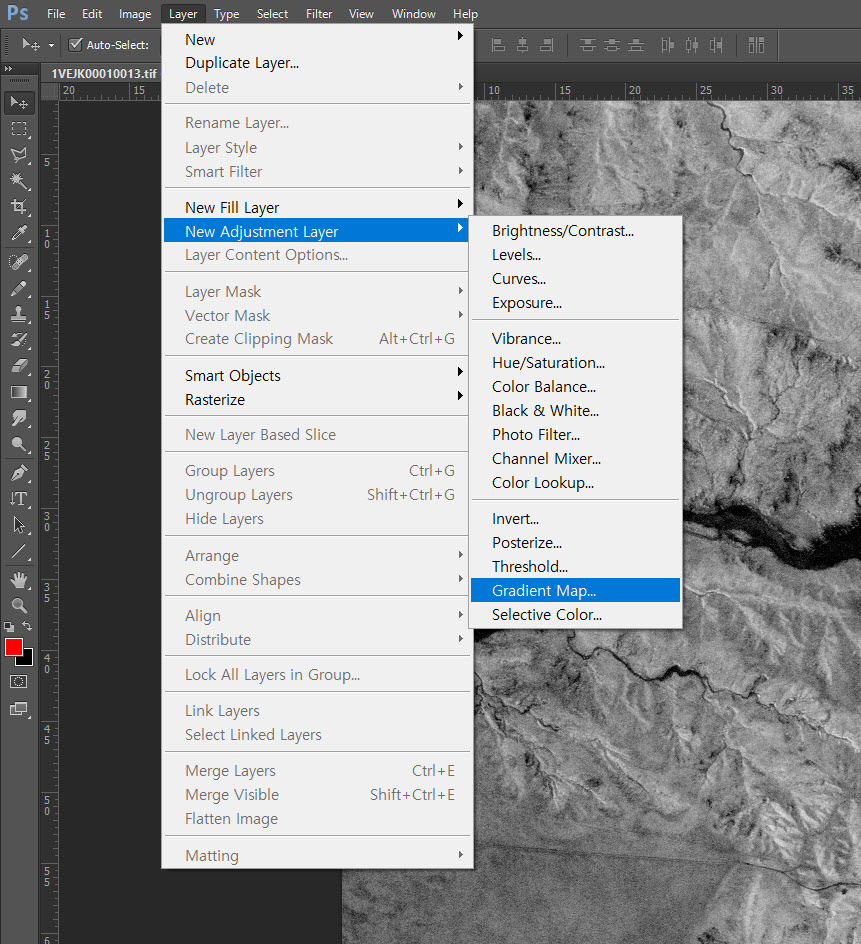 2)흑백 이미지 레이어를 선택하고 상단의 layer 메뉴에서 new adjustment layer의 gradient map를 선택합니다.