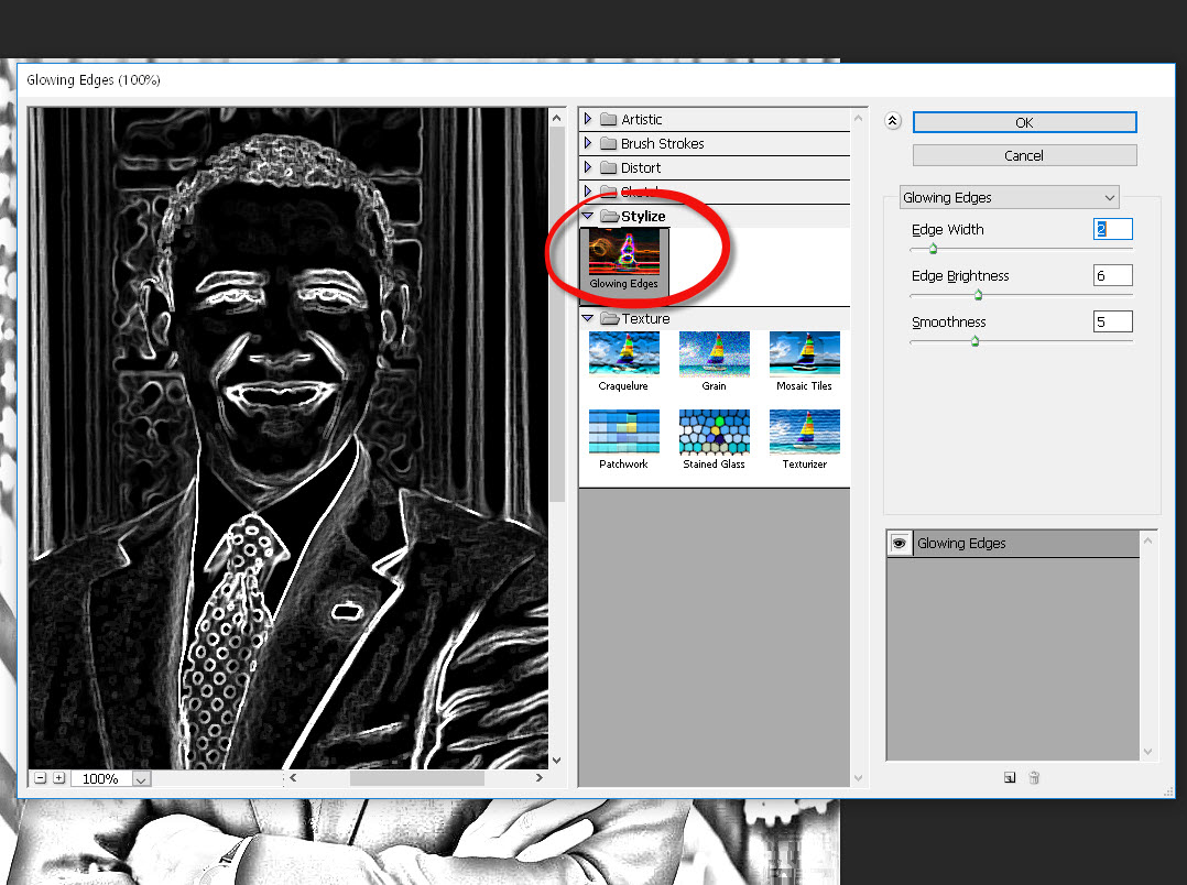 11)필터 갤러리(filter gallery)에서 stylize의 glowing edges를 적용합니다.