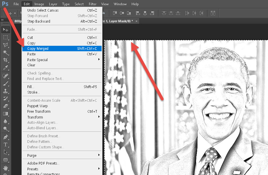 8)최상위 레이어에서 이미지의 모든 영역을 선택하고 edit 메뉴의 copy merged를 선택합니다.