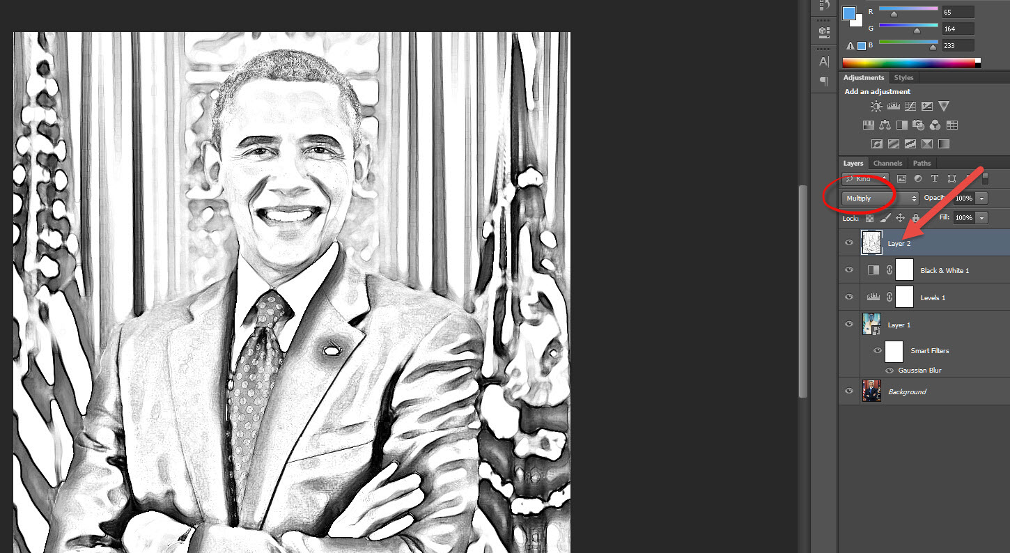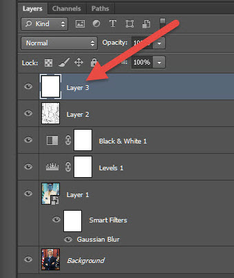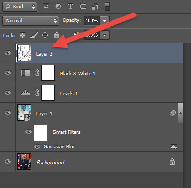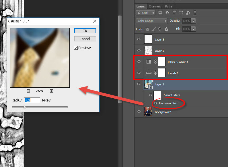15)스마트 필터(gaussian blur)와 adjustment layer(levels, black & white)를 조정하여 완성합니다.