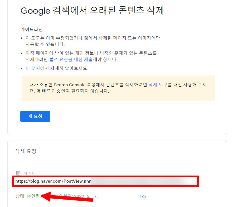 9)시간이 경과하여 게시글이 검색 결과에서 정상적으로 삭제가 완료되면 상태가 승인됨으로 표시됩니다.