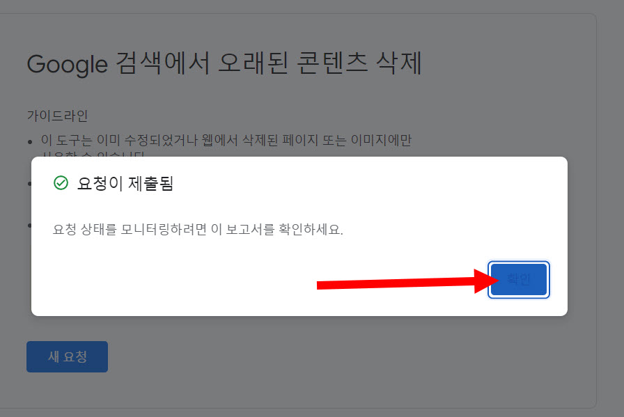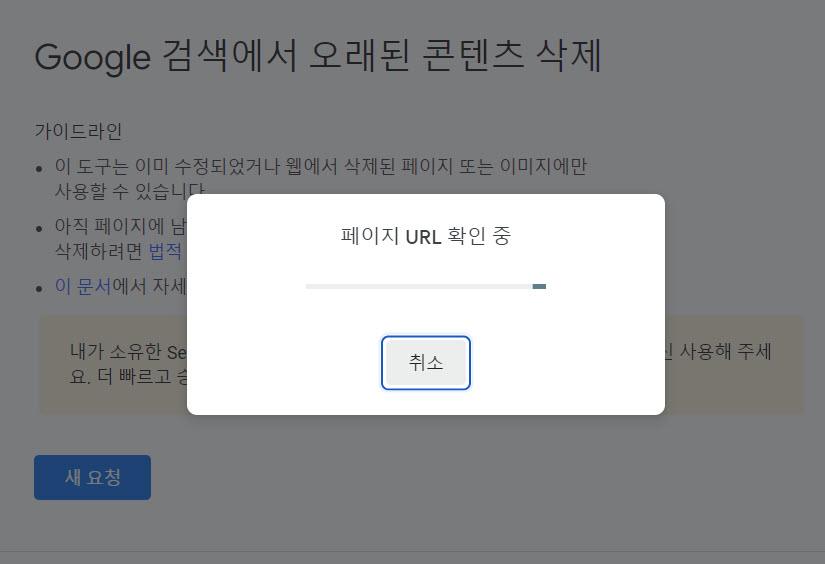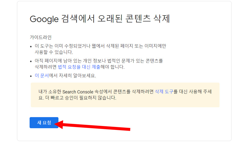 6)오래된 콘텐츠 삭제 도구에서 블로그 또는 웹사이트에서 이미 삭제된 페이지 또는 이미지를 구글검색에서 삭제하도록 요청할수있습니다. 새 요청을 클릭합니다.