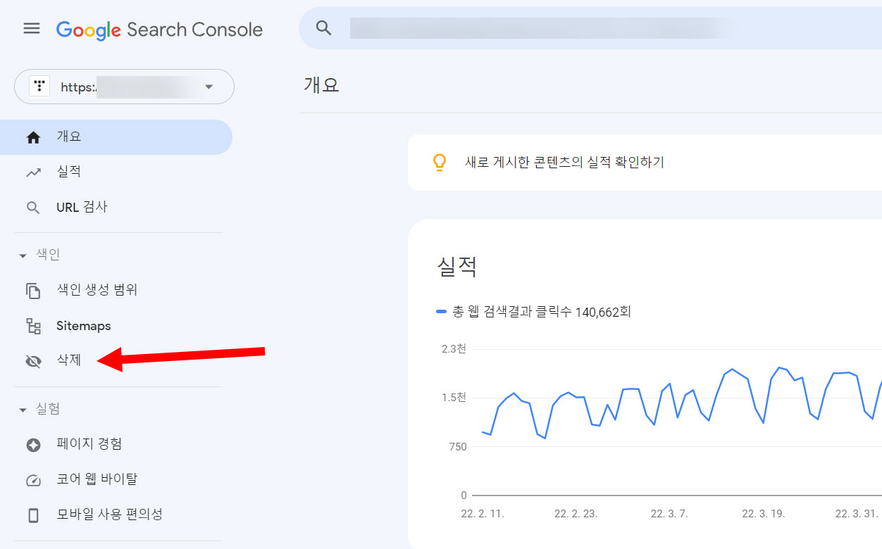 3)구글 검색 결과에서 게시글을 완전히 삭제하려면 구글 서치 콘솔(google search console)에서 삭제 메뉴로 이동합니다.