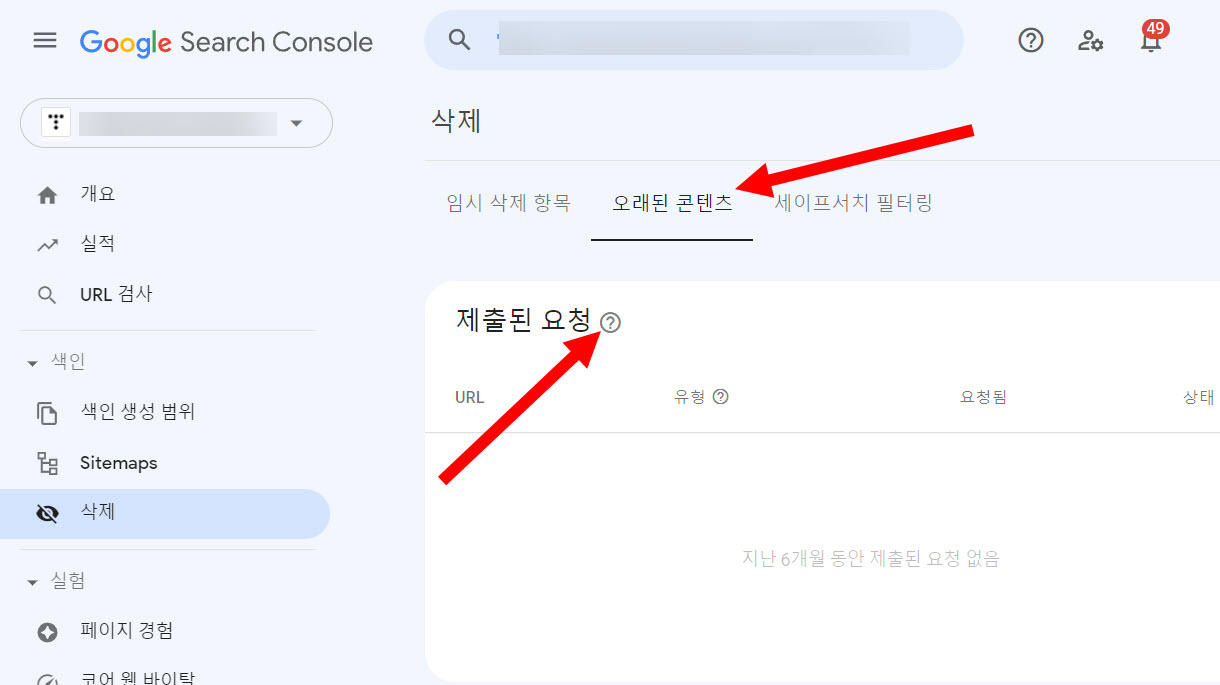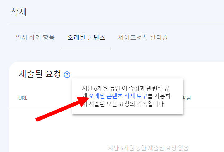 4)오래된 콘텐츠의 제출된 요청 우측 물음표를 클릭합니다.