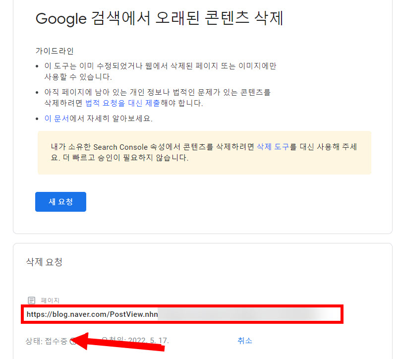 8)요청이 제출되면 삭제 요청 목록에서 확인할수있으며 상태가 접수중이라고 표시됩니다.