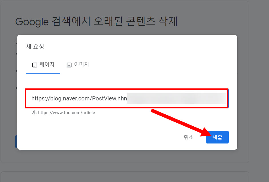 7)페이지 및 게시글의 URL을 입력하고 제출을 클릭합니다.