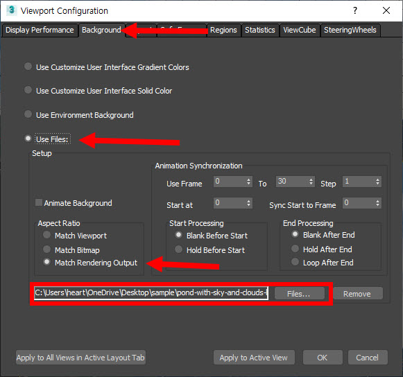 9)background에서 use files에 체크하고 뷰포트 배경에 사용할 이미지를 설정합니다.