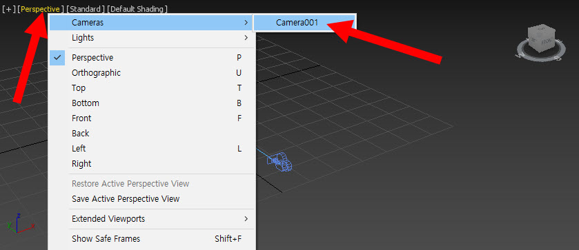 3)뷰포트를 선택하고 생성한 카메라의 뷰를 선택합니다(camera001)