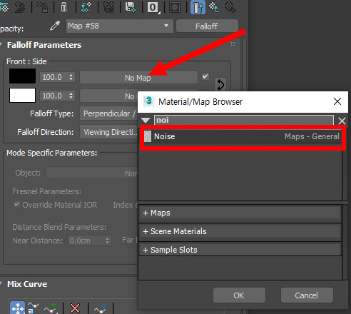 9)falloff 맵의 front에 노이즈(noise) 맵을 추가합니다.