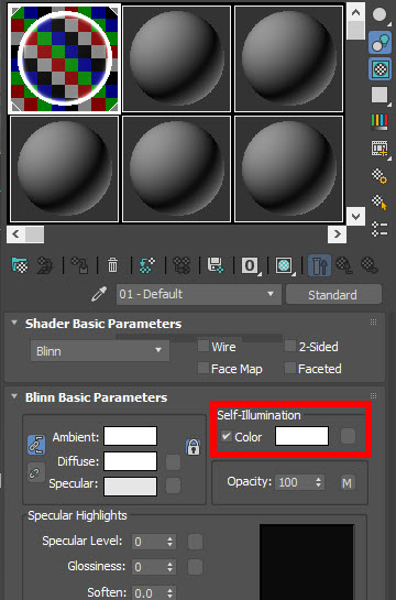 13)재질의 self-illumination에서 color에 체크하고 흰색을 설정합니다.