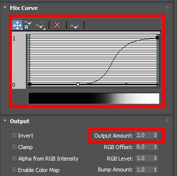 8)falloff 맵의 mix curve에서 그래프를 수정하고 output에서 output amount 수치를 높입니다.