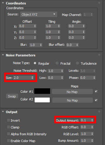 11)노이즈 맵의 noise parameters에서 노이즈의 크기(size)를 설정하고 output에서 output amount 수치를 낮춥니다.