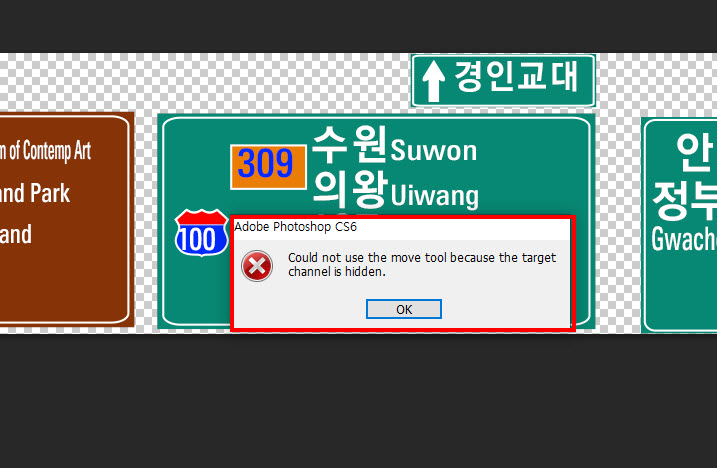 move tool을 사용하여 이미지를 이동할때 아래와 같은 문구가 표시되며 사용이 안되는 경우