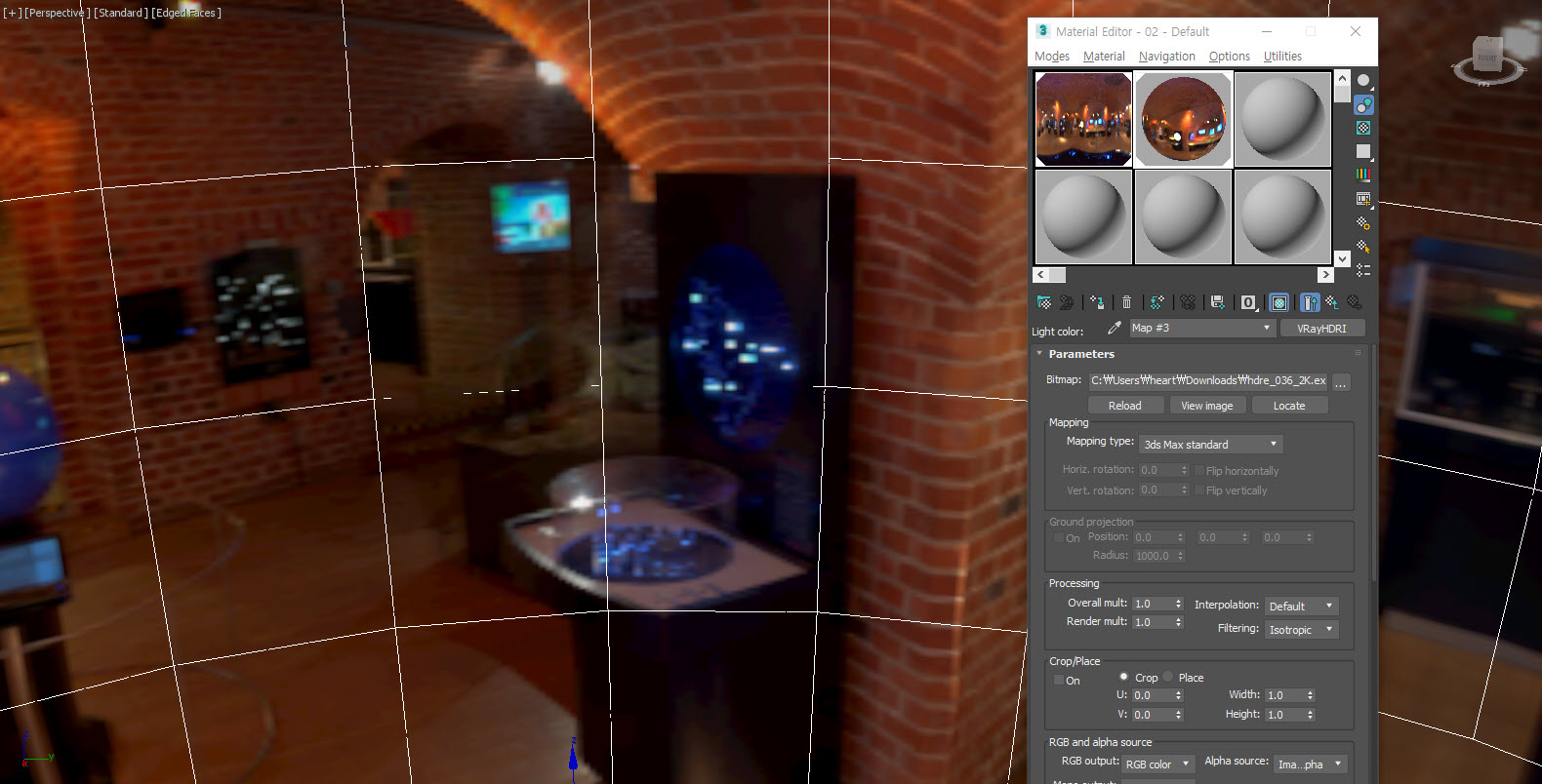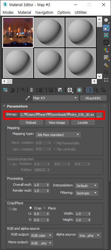 2)VRayHDRI 맵의 bitmap에 환경맵으로 사용할 이미지를 설정합니다.