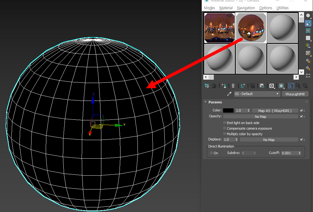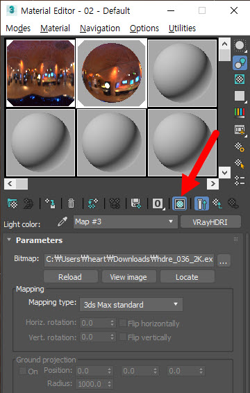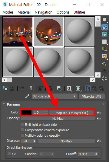 6)VRayHDRI 맵을 브이레이 라이트 재질(VRayLightMtl)의 color 맵으로 설정합니다.