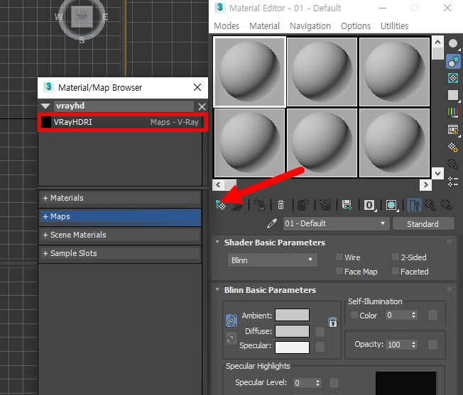 1)재질 편집기의 재질 슬롯에 VRayHDRI 맵을 추가합니다(get material에서 VRayHDRI 맵을 선택)