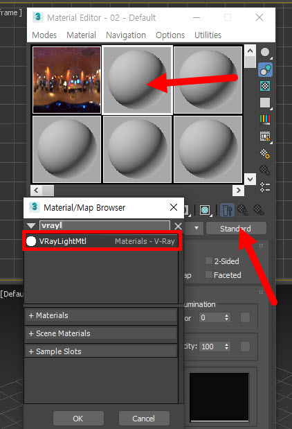 5)재질 슬롯에 새로운 브이레이 라이트 재질(VRayLightMtl)을 설정합니다.
