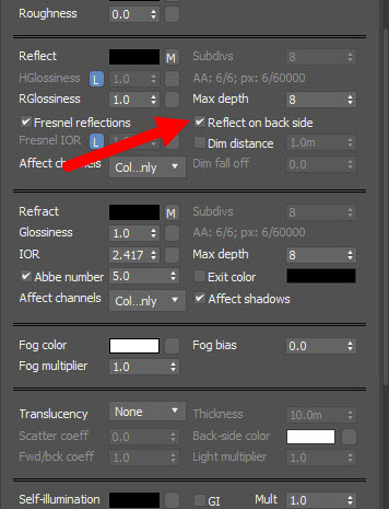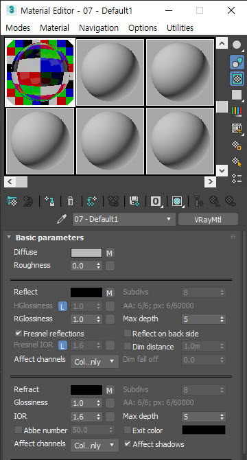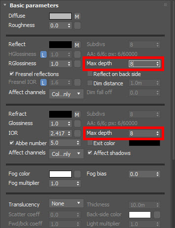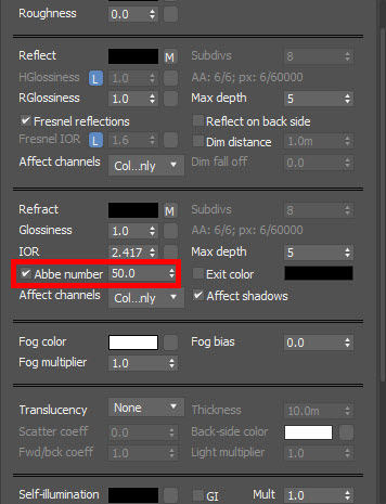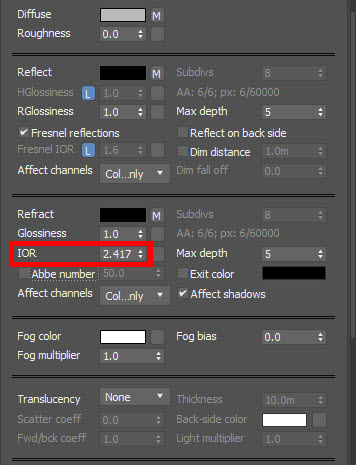 브이레이 재질(VRayMtl)을 사용하여 다이아몬드 재질 표현하는 방법(반사reflect, 굴절refract, IOR, abbe number, max depth, reflect on back side)
