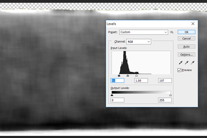 3)이미지에 adjustment의 levels를 적용하고 이미지의 대조를 높이면 얼룩의 분포를 확인할수있습니다.