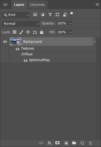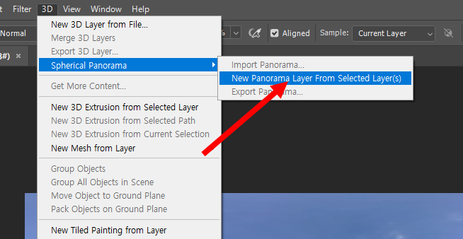 2)레이어를 선택하고 상단의 3D 메뉴에서 spherical panorama의 new panorama layer from selected layer를 선택합니다.