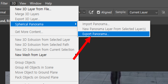 7)편집한 이미지를 저장하려면 상단의 3D 메뉴에서 spherical panorama의 export panorama를 선택합니다.