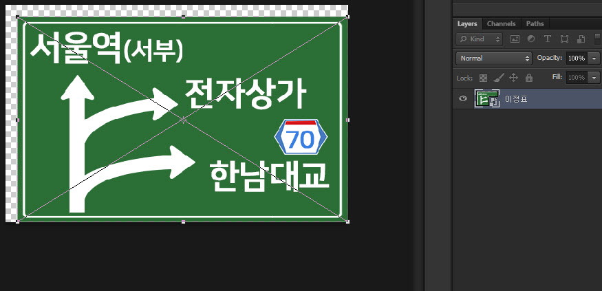 4)스마트오브젝트는 구성 레이어의 원본 데이터를 가지고있기때문에 사이즈를 줄였다가 이후 다시 키워도 해상도를 유지합니다. transform tool을 사용하여 이미지의 크기를 줄입니다.
