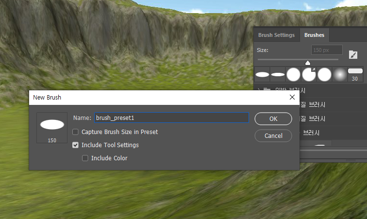 5)include tool settings에 체크하고 확인하면 현재 설정한 브러시를 프리셋으로 저장합니다.