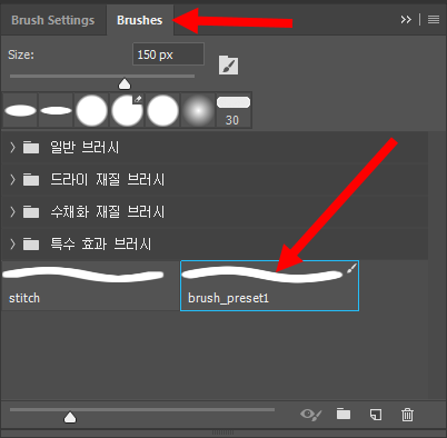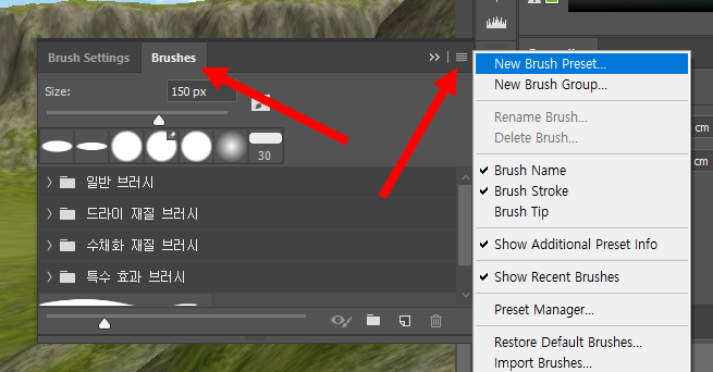 4)설정을 마치면 brushes 패널에서 아래 표시한곳을 클릭하고 new brush preset을 선택합니다.