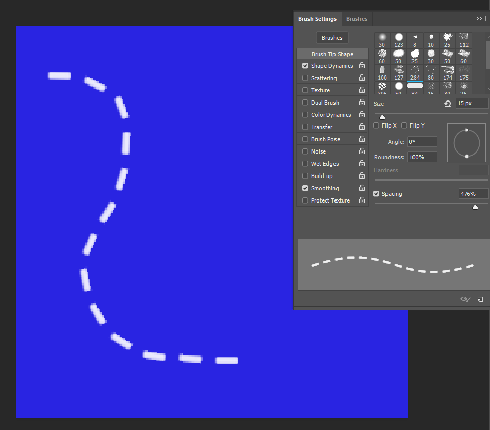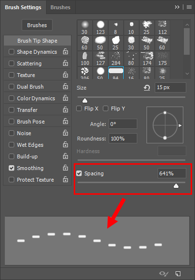 8)브러시 세팅의 spacing에서 바느질 간격을 설정합니다.