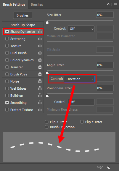 9)shape dynamics 항목에 체크하고 angle jitter의 control에서 direction을 선택합니다.