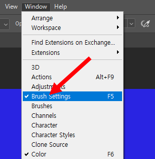 7)상단의 window 메뉴에서 brush settings로 이동합니다.
