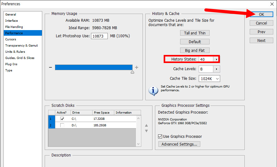 3)history states의 수치를 높여서 undo의 최대개수를 설정하고 확인합니다.